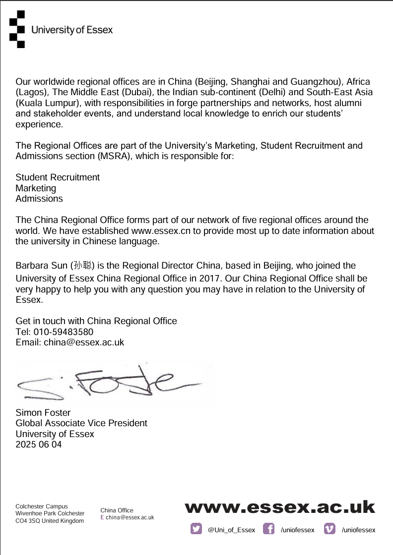 埃塞克斯大学中国办公室为其位于海外的五大国际办公室之一, 大学特别建立此中文官网www.essex.cn,为中国用户提供最新的大学官方资讯。